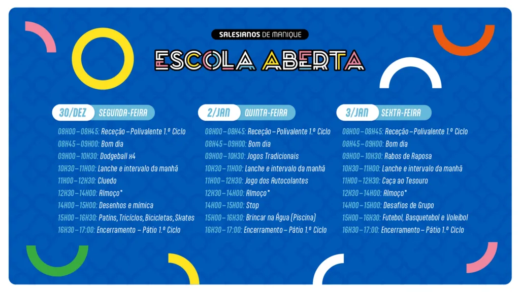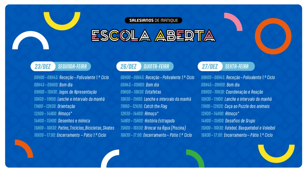 *Almoço: trazer de casa ou marcar no DNA online até às 21h00 do dia anterior Material: Roupa e calçado desportivo, bebedouro reutilizável, Lanches (manhã e tarde), equipamento de piscina (fato de banho, touca, toalha e chinelos)