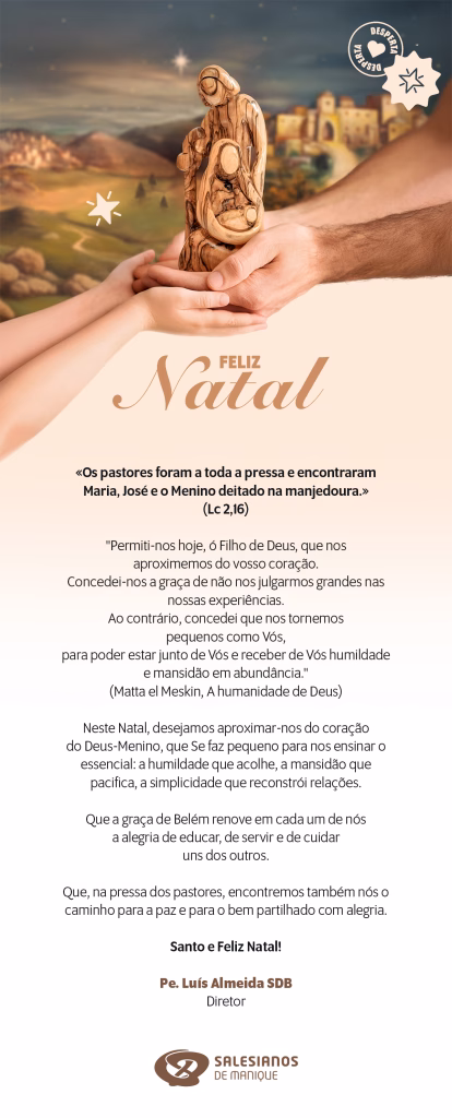 Os Salesianos de Manique convidam toda a comunidade educativa para a Festa de Natal 2025. Será na sexta-feira, dia 19 de dezembro, às 18h30, no pavilhão. A abertura de portas será às...